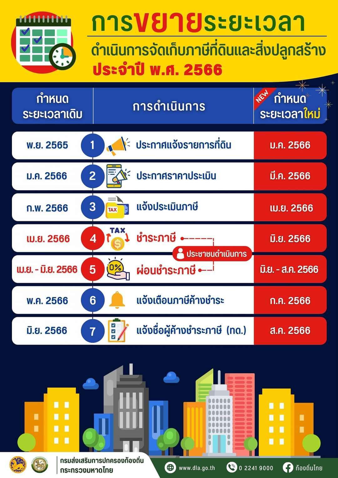 การขยายกำหนดเวลาดำเนินการตามพระราชาบัญญัติภาษีที่ดินและสิ่งปลูกสร้าง พ.ศ. 2562 เฉพาะการจัดเก็บภาษีทีดินและสิ่งปลูกสร้างประจำปี พ.ศ.2566 เป็นการทั่วไป ออกไปอีก 2 เดือน