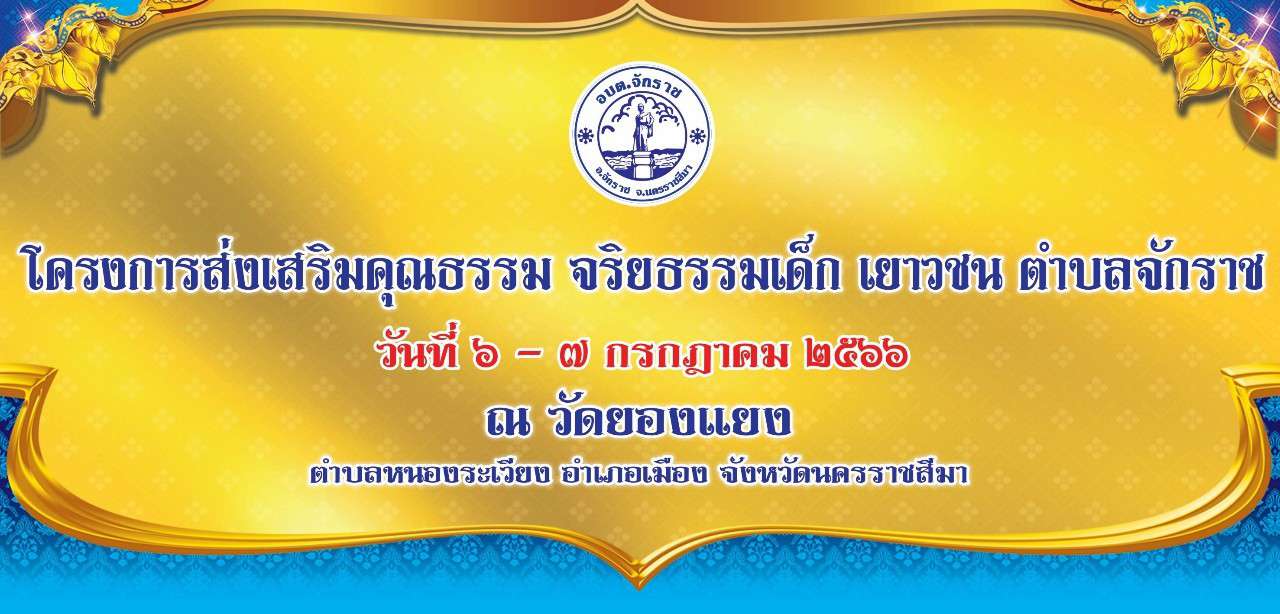 กองการศึกษา ศาสนา และวัฒนธรรม สังกัด องค์การบริหารส่วนตำบลจักราช จัดทำ?โครงการส่งเสริมคุณธรรมจริยธรรมเด็ก เยาวชน ตำบลจักราช? ระหว่างวันที่ ๖ - ๗ กรกฎาคม ๒๕๖๖ เพื่อให้เด็กและเยาวชนตำบลจักราชที่จะเป็นกำลังสำคัญในการพัฒนาประเทศชาติให้เจริญก้าวหน้า ทั้งด้านเศรษฐกิจ สังคม และความมั่นคงของชาติในอนาคต เยาวชนที่มีคุณภาพ S:1