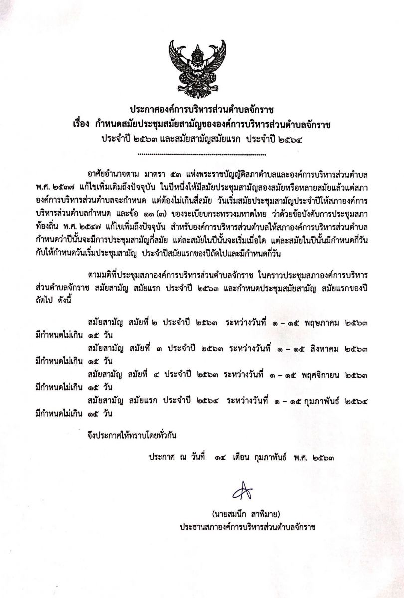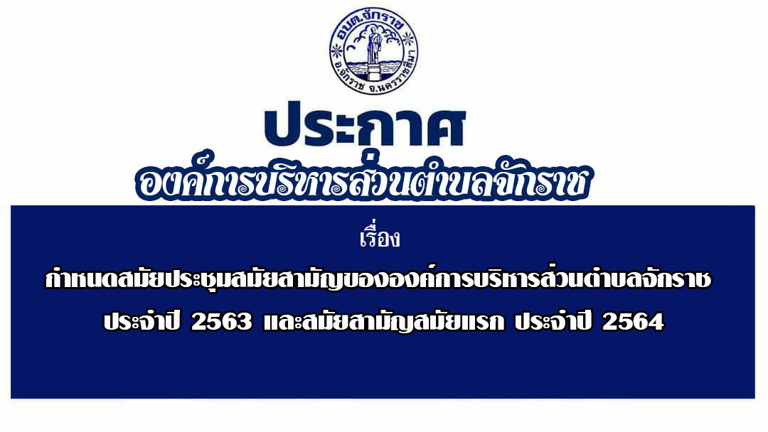 ประกาศ เรื่องกำหนดสมัยประชุมสมัยสามัญขององค์การบริหารส่วนตำบลจักราช ประจำปี 2563 และสมัยสามัญสมัยแรก ประจำปี 2564