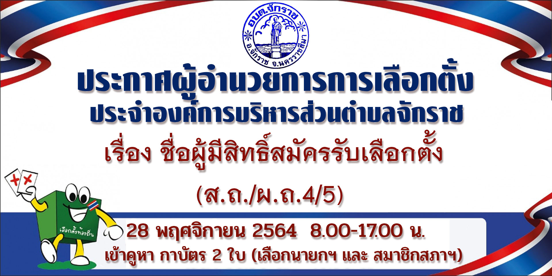 ประกาศ ชื่อผู้มีสิทธิ์สมัครรับเลือกตั้งสมาชิกสภา อบต. และนายก อบต.จักราช