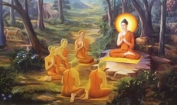 พระพุทธองค์ก็เสด็จถึงป่าอิสิปตนมฤคทายวันแขวงเมืองพาราณสีอันเป็นที่อยู่แห่งปัจจวัคคีย์พอเสด็จ เข้าราวป่าพวกปัญจจวัคคีย์นั้นได้เห็นจึงนัดหมายกันว่า จะไม่ไหว้ ไม่ลุกรับ และไม่รับบาตรจีวรจะตั้งไว้ให้เพียงอาสนะเท่านั้น เพราะเข้าใจว่าพระองค์ กลายเป็นคนมีความมักมากหมดความเพียรเสียแล้ว พอพระองค์เสด็จถึง ต่างก็พูดกับพระองค์โดยไม่เคารพพระองค์ตรัสห้ามและทรงบอกว่าพระองค์ตรัสรู้แล้วจะแสดงธรรมสั่งสอนให้ฟังพราหมณ์ทั้ง ๕ ก็พากันคัดค้านลำเลิกด้วยถ้อยคำต่างๆ ที่สุดพระองค์จึงทรงแจงเตือนให้รำลึกว่า พระองค์เคยกล่าวเช่นนี้มาในหนหลังบ้างหรือ พราหมณ์ทั้ง๕ ระลึกได้ ต่างก็สงบตั้งใจฟังธรรมทันที