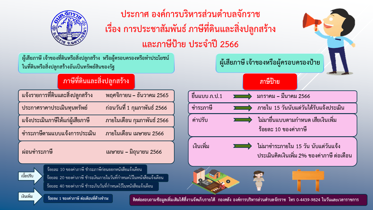 ประกาศ องค์การบริหารส่วนตำบลจักราช เรื่อง การประชาสัมพันธ์ ภาษีที่ดินและสิ่งปลูกสร้าง และภาษีป้าย ประจำปี 2566
