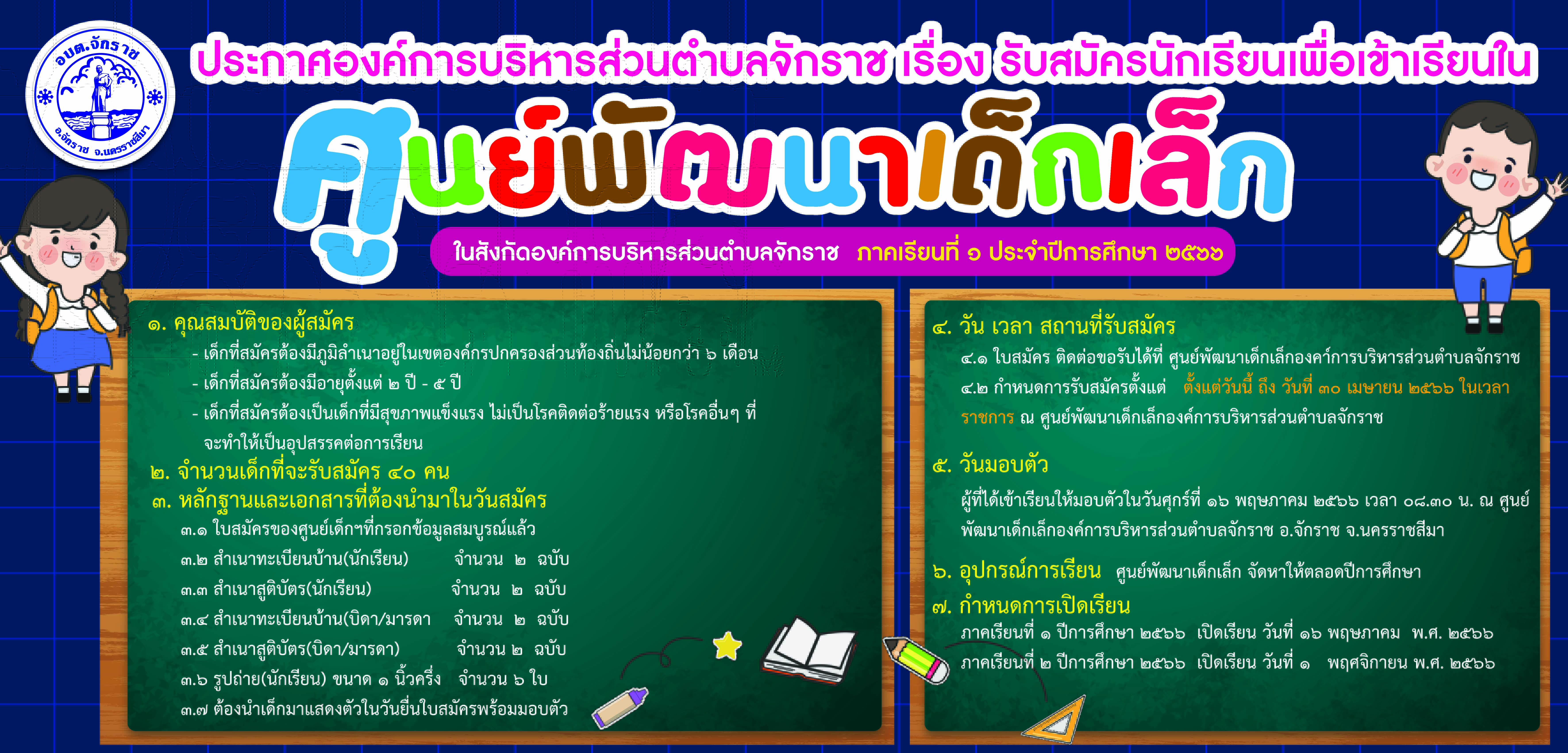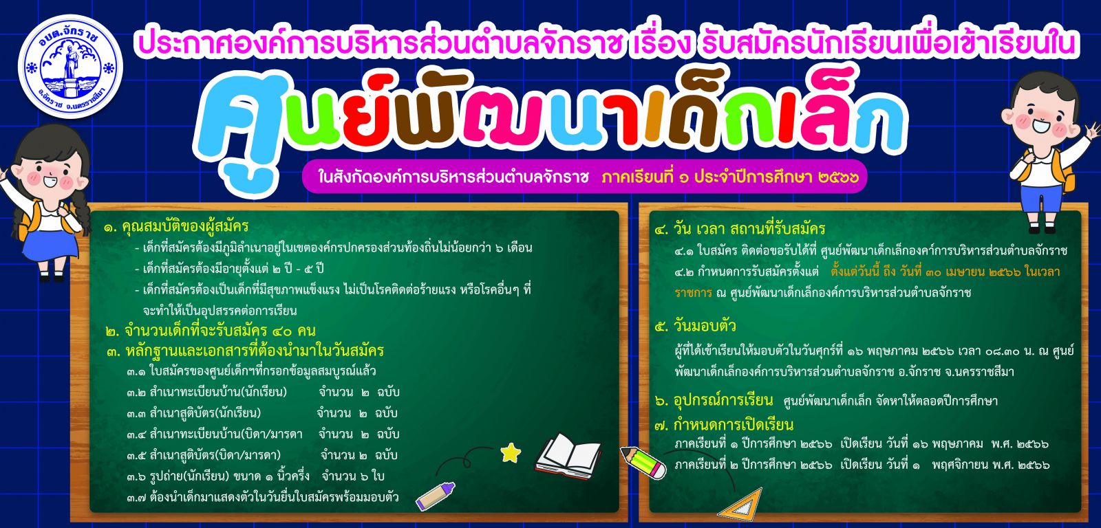 ประกาศรับสมัครเด็กนักเรียนเพื่อเข้าเรียนในศูนย์พัฒนาเด็กเล็กองค์การบริหารส่วนตำบลจักราช