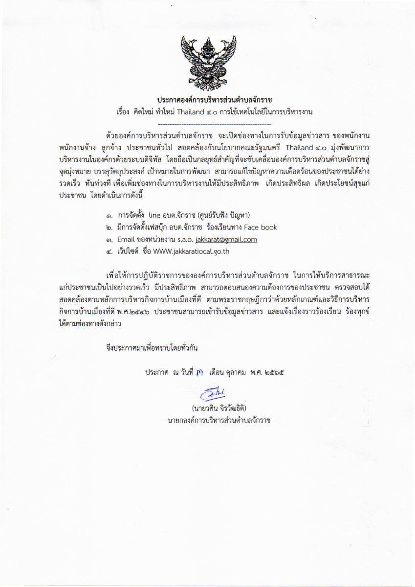 ประกาศองค์การบริหารส่วนตำบลจักราช เรื่อง คิดใหม่ ทำใหม่ Thailand 4.0 การใช้เทคโนโลยีในการบริหารงาน